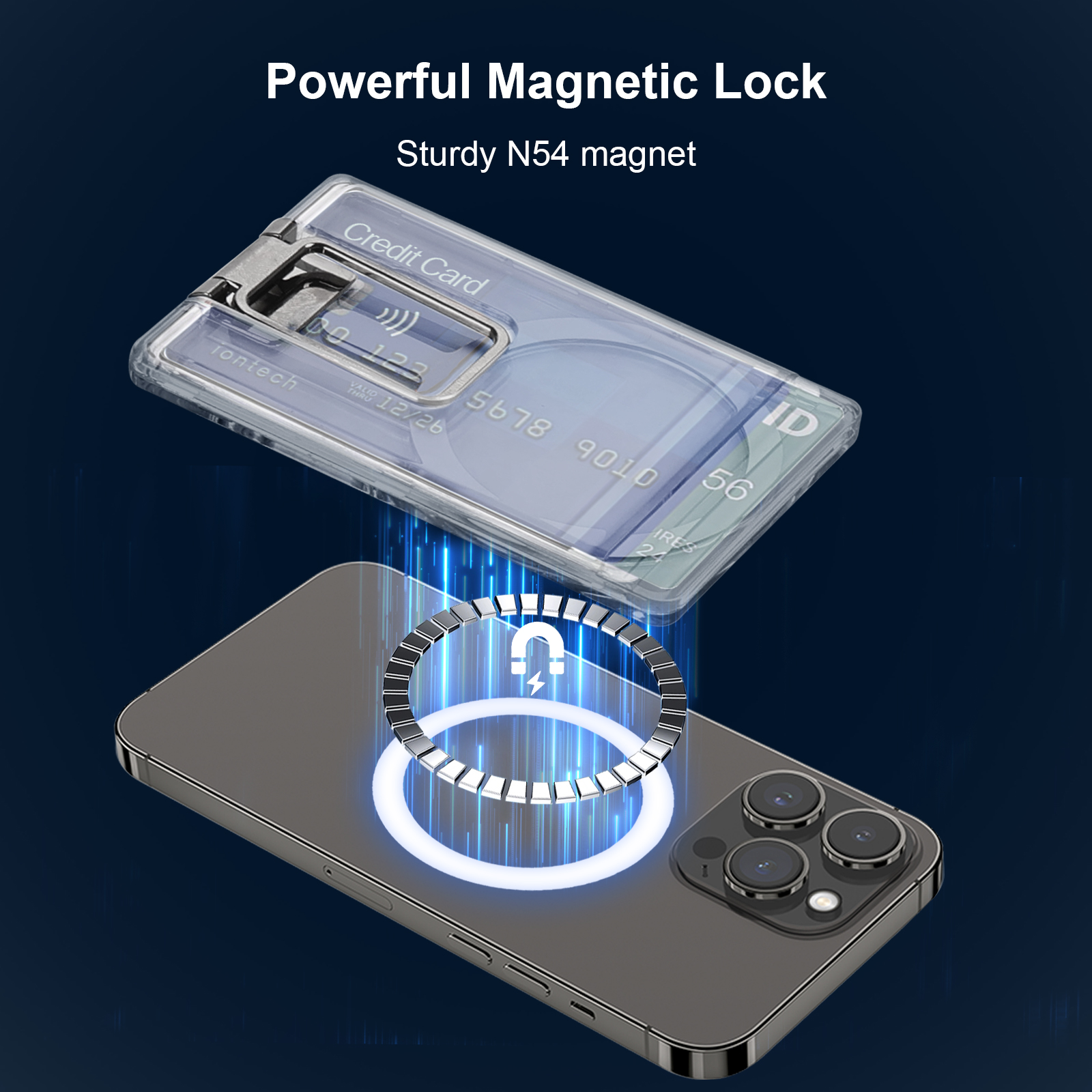 𝐏𝐨𝐰𝐞𝐫𝐟𝐮𝐥 𝐌𝐚𝐠𝐧𝐞𝐭𝐢𝐜 𝐋𝐨𝐜𝐤: The durable PC material grants it crystal-clear appearance, enabling you to show your ID without the need to pull it out. The stronger magnetic lock, equipped with larger and stronger N54 magnets that offer triple the holding strength. This provides a powerful magnetic force to secure the magnetic card wallet holder to your phone and makes it easily detachable when not needed. With its combination of PC material, metal stand, and powerful magnet, this magnetic card holder is an essential accessory for your phone